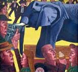 John explains that the scene for these images is an imagined one, set in the near future when the last surviving example of the animal is being paraded from town to town, to give people one last chance to see it. Originally the animal was in a cage but the bars obscured the view of the creature so John removed them. Most of the people in the image are on the whole indifferent to the fact that the elephant portrayed is the last of its kind and there is a kind of carnival atmosphere, where only one or two people try to draw the crowd’s attention to the headline in the paper the man is holding.